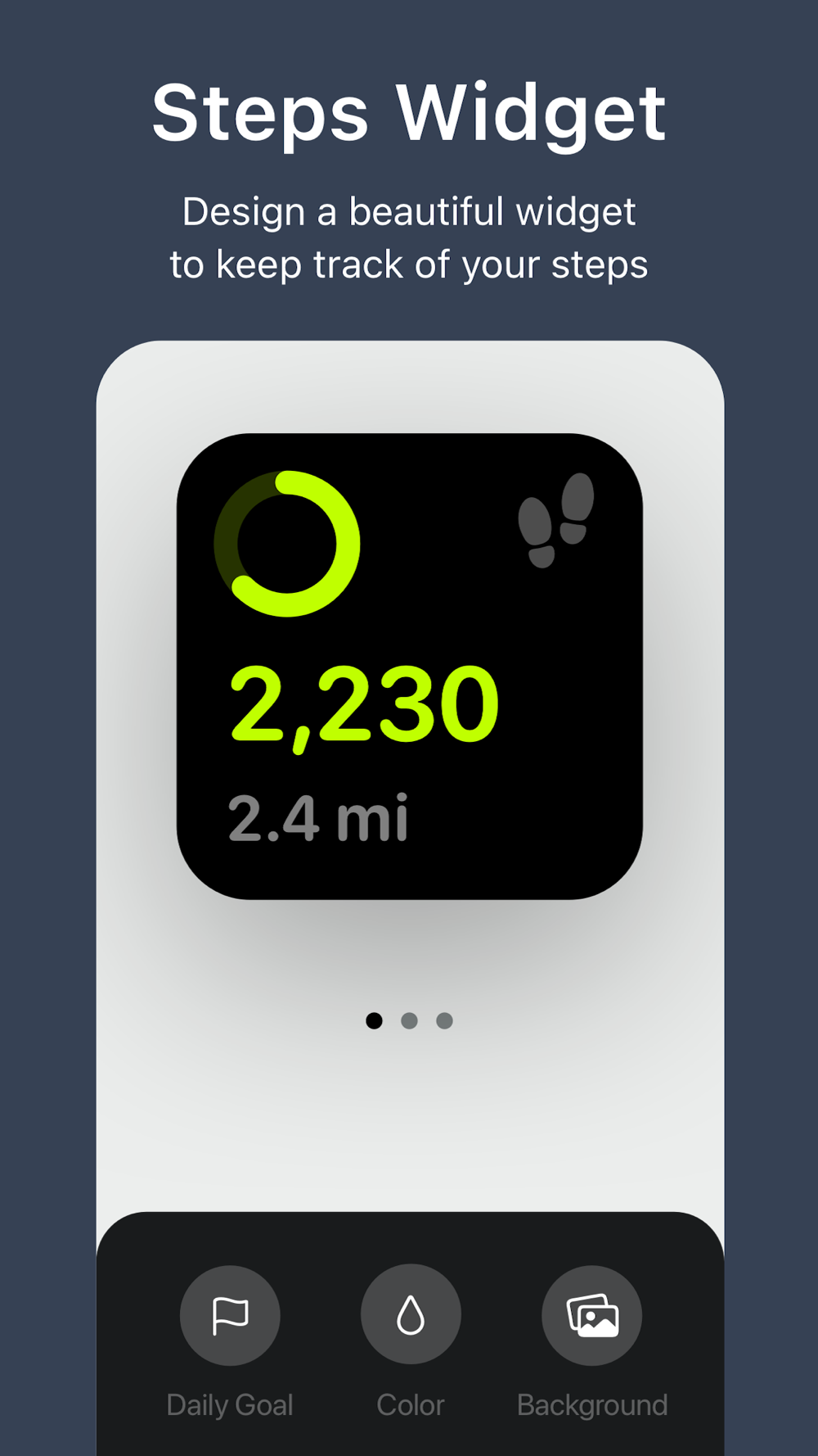 Steps Widget is the easiest way to stay motivated to hit your step goals by displaying a gorgeous and fully customizable widget on your homescreen. Step counter is simple to use, just set a step goal and add the widget to your home screen, the widget will automatically track steps and stay in sync with your HealthKit data. Steps tracker is perfect for you whether you're walking around the neighborhood or training for a marathon.