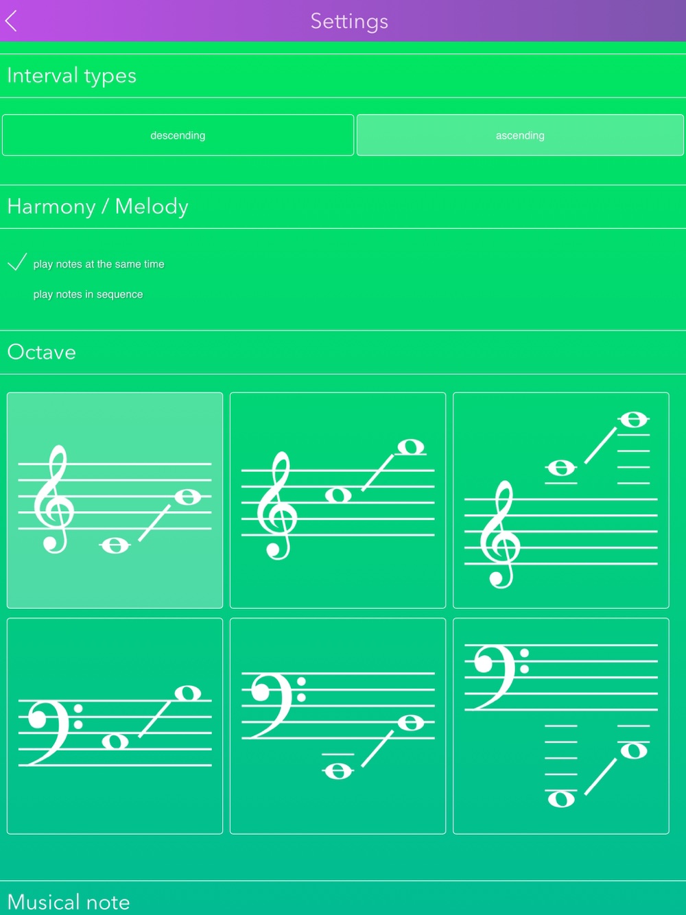 At the beginning of classes, you can choose the musical intervals and notes that you want to study. After that, you can select and adjust the musical instrument and octave. In the basic version of the app, you can choose to practice piano or guitar. You will be able to train relative pitch and perfect pitch by guessing musical intervals and notes.