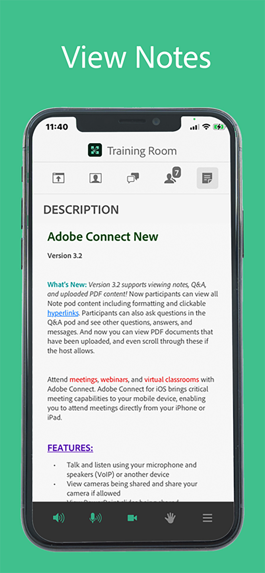 Note: This application is NOT for watching recordings. Adobe Connect recordings can be viewed using a standard mobile browser while online.