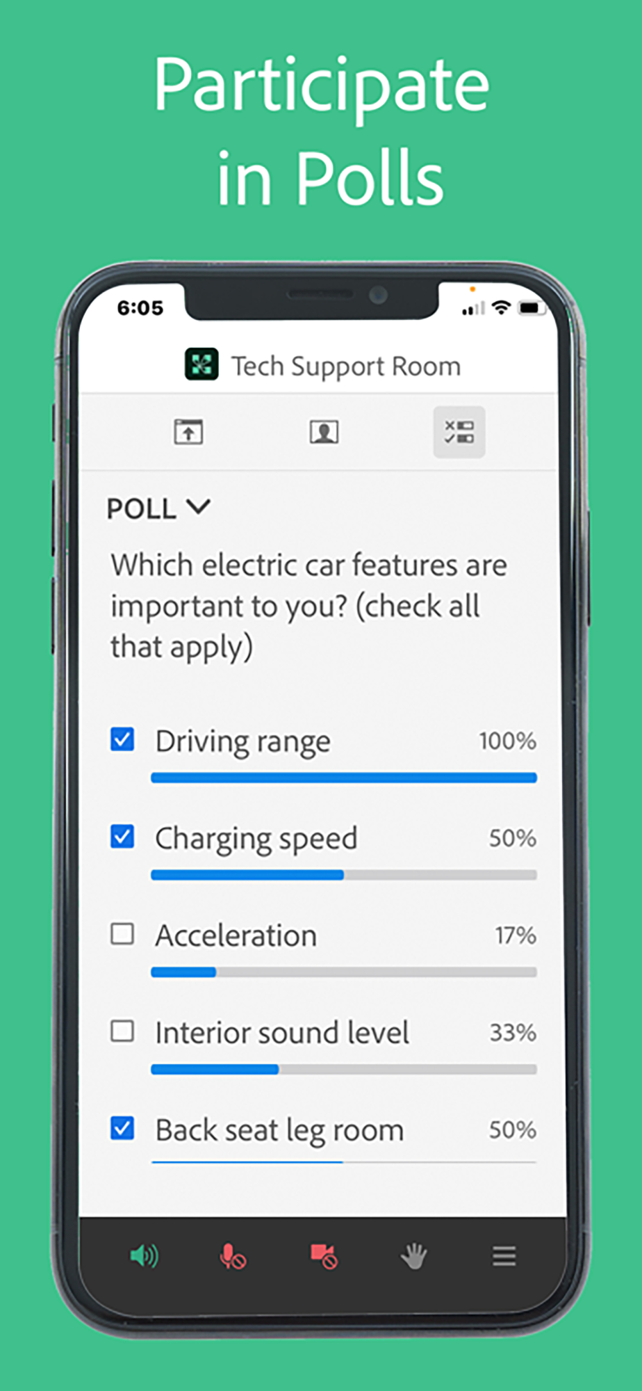 • Participate in polls, including multiple-choice, multiple-answer, and short answer
