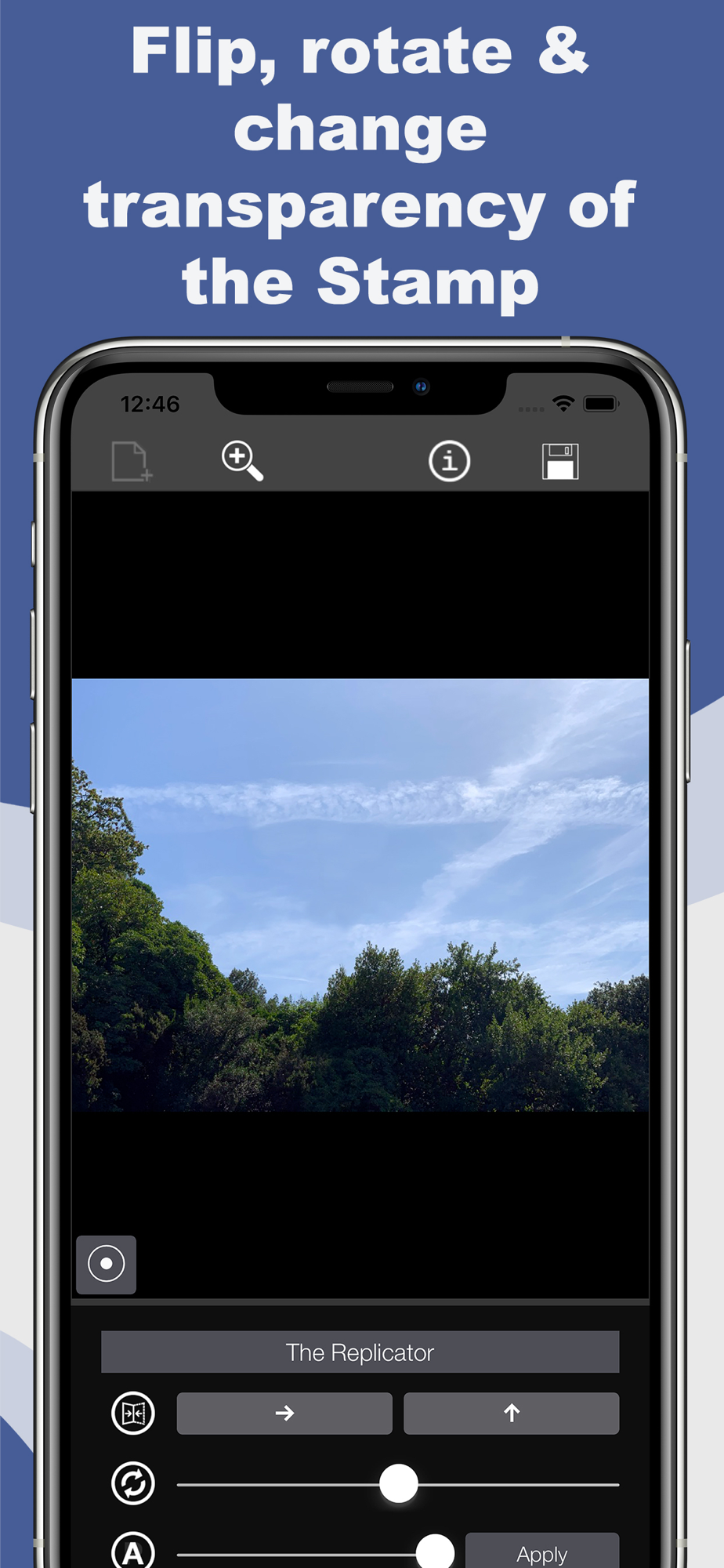 You can define the part to copy just by drawing on the image and you can adjust the settings in order to better melt it with the photo, you can also rotate and flip it.