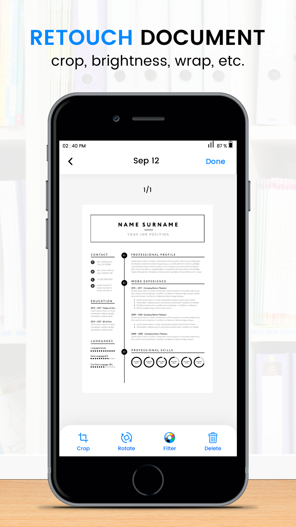 Digitize with the system camera all of your essential papers, or add files from the Folder. You can search various work records, pictures, graphic content, ID cards and files, books, magazines, magazine articles, receipts, business cards, whiteboards, text on various photos, bills, surveys, invoices, research notes, certificates, contracts with your business partners and customers and more! If you manage a lot of business papers the e-sign feature of the app will be a real time-saver for you. Scan, sign, and email documents to your partner or client – yes, with our PDF scanner, it's that simple and easy! You can also save your signature for all other papers, and use it.