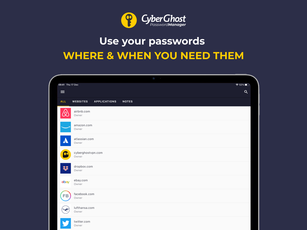 Unburden your memory, fortify the security of your online accounts, and never waste time on failed login attempts with CyberGhost Password Manager. Store all your essential passwords in an encrypted, super-secure, and hacker-free place.