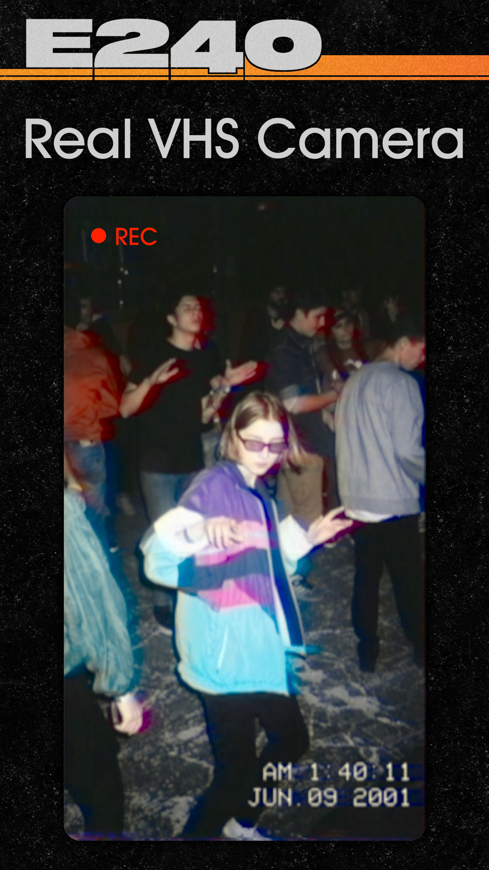 E240 is a realistic VHS camera. The main difference from other VHS camera apps is the filter itself: E240 not just simulates the effect, but actually films with the same principles as real VHS cameras did!