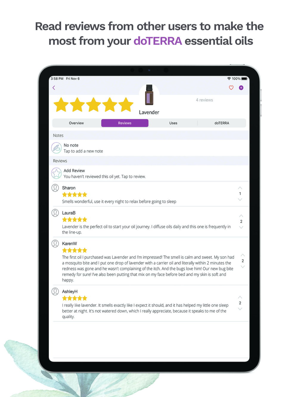 • RATINGS & REVIEWS: See star ratings and read real user reviews for every doTERRA™ oil and for hundreds of our oil recipes.