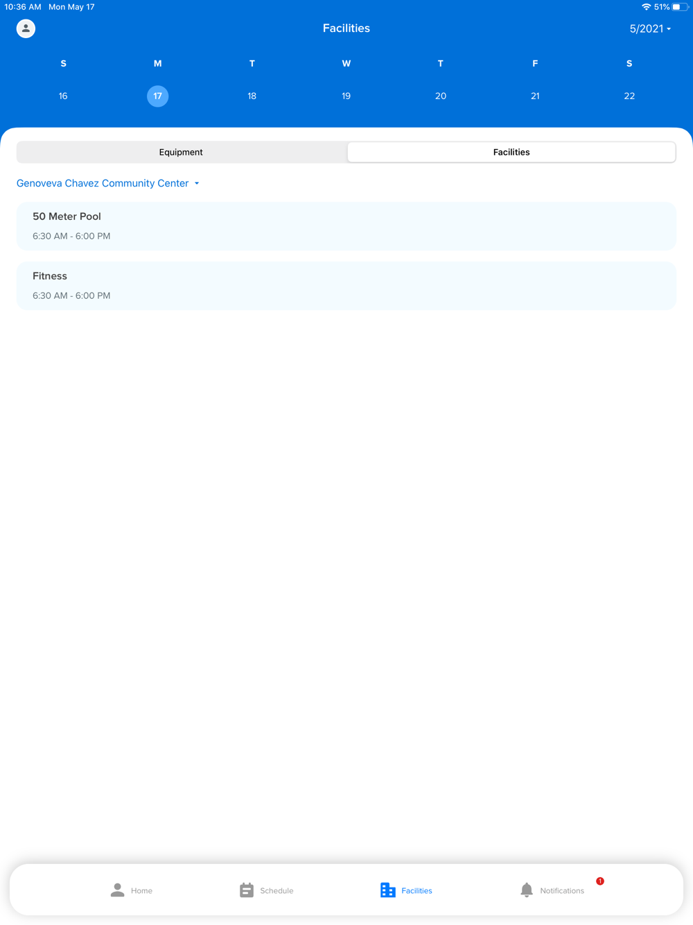 on the Facilities tab, view and reserve equipment.