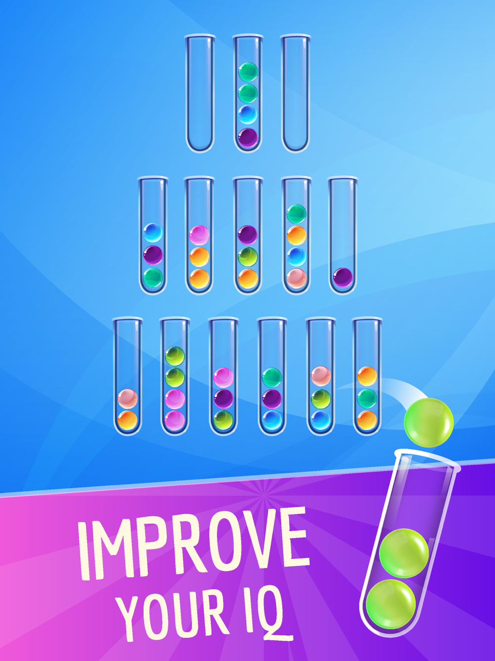 Color Sorting is an addictive and challenging puzzle game! Try to sort the colored balls in the tubes until all balls with the same color celebrating completion in the same tube. Try to challenge and exercise your brain!