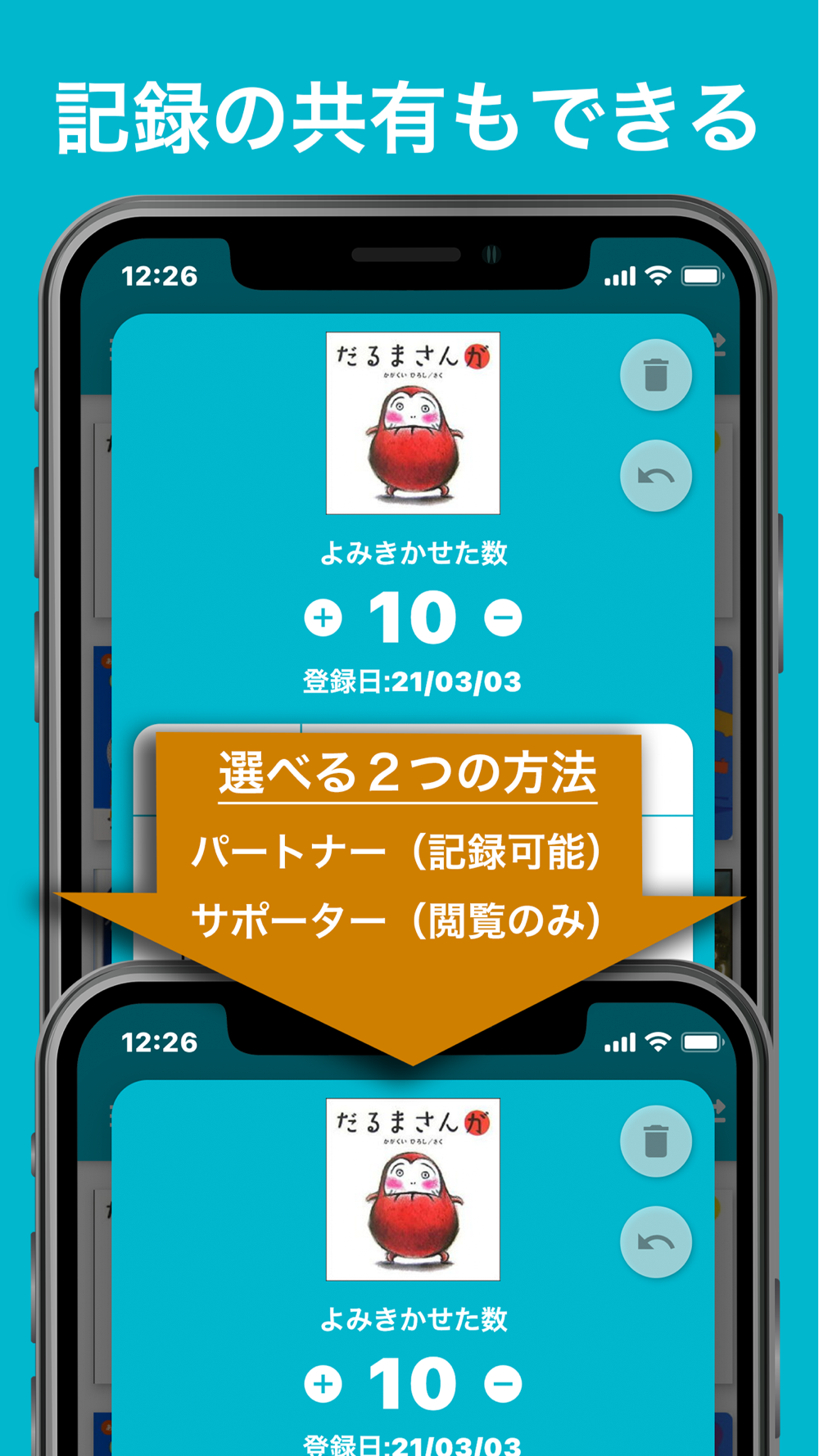 2つの共有方法があります。1つは「パートナー」で、読み聞かせ記録の編集や新しいユーザーの招待が可能です。2つめは「サポーター」で、絵本の読み聞かせ記録を閲覧のみ可能です。