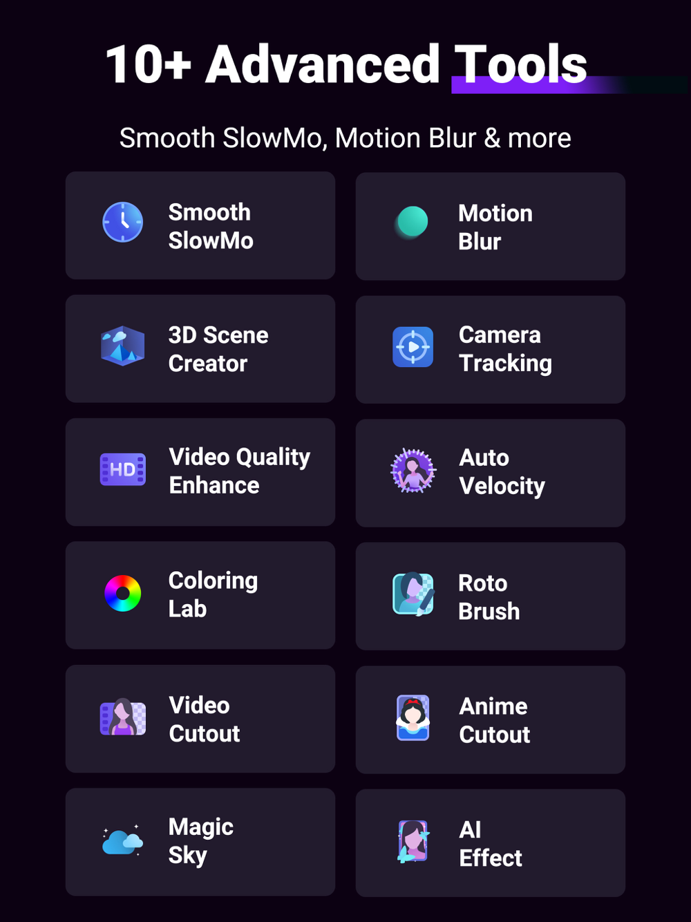 Smooth Slow Motion with Optical Fow; Frame Rate Changer; Motion Blur; Photo & Video Quality Enhancer; Color Lab; 3D Camera Tracking; Auto Velocity Edit; Moving Picture Editor; AI Effects; Video Magic Sky Replacement and more!