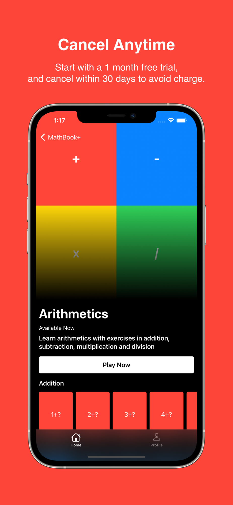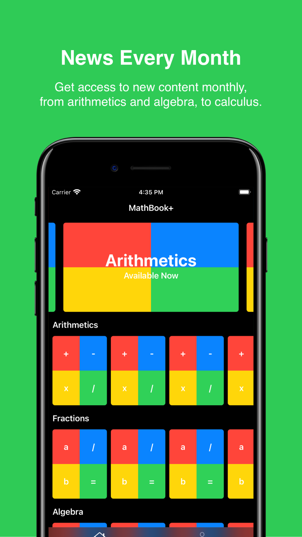 Solve several hundred exercises in addition, subtraction, multiplication and division. Start with a 1 month free trial, and cancel within 30 days to avoid charge. Get access to new content monthly, from arithmetics and algebra, to calculus.