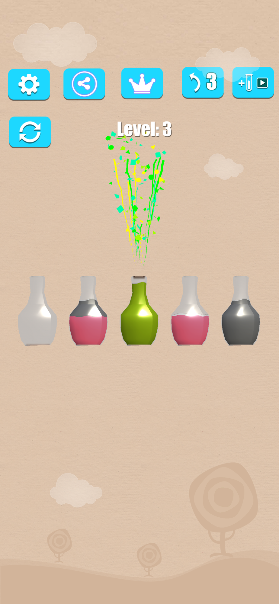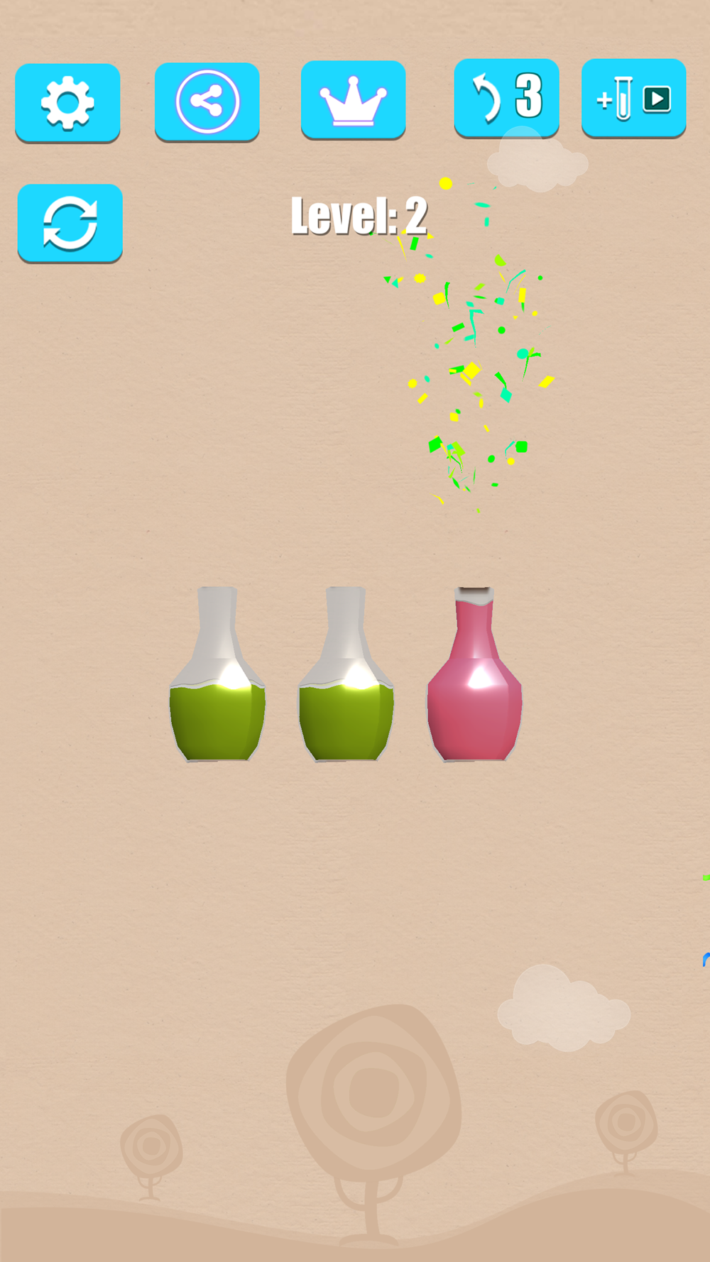 • Tap any glass bottle to pour color water to another to fill the glass with color.
