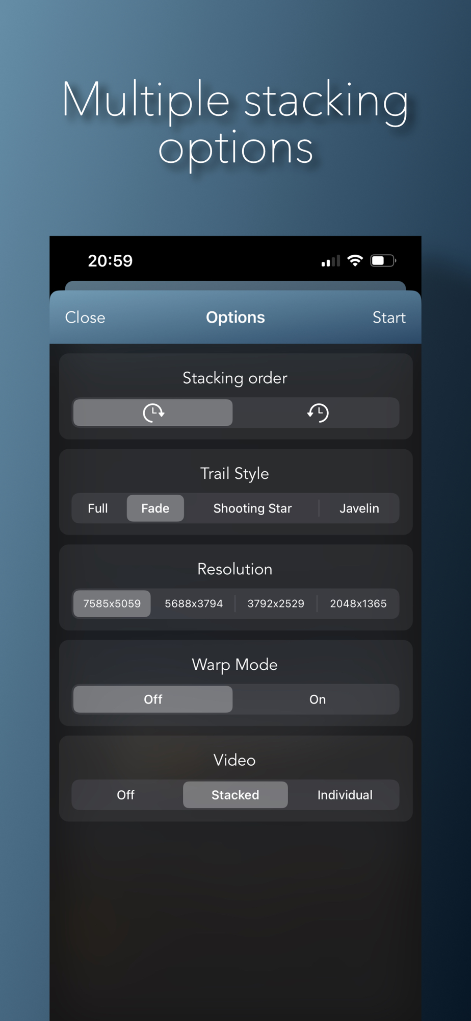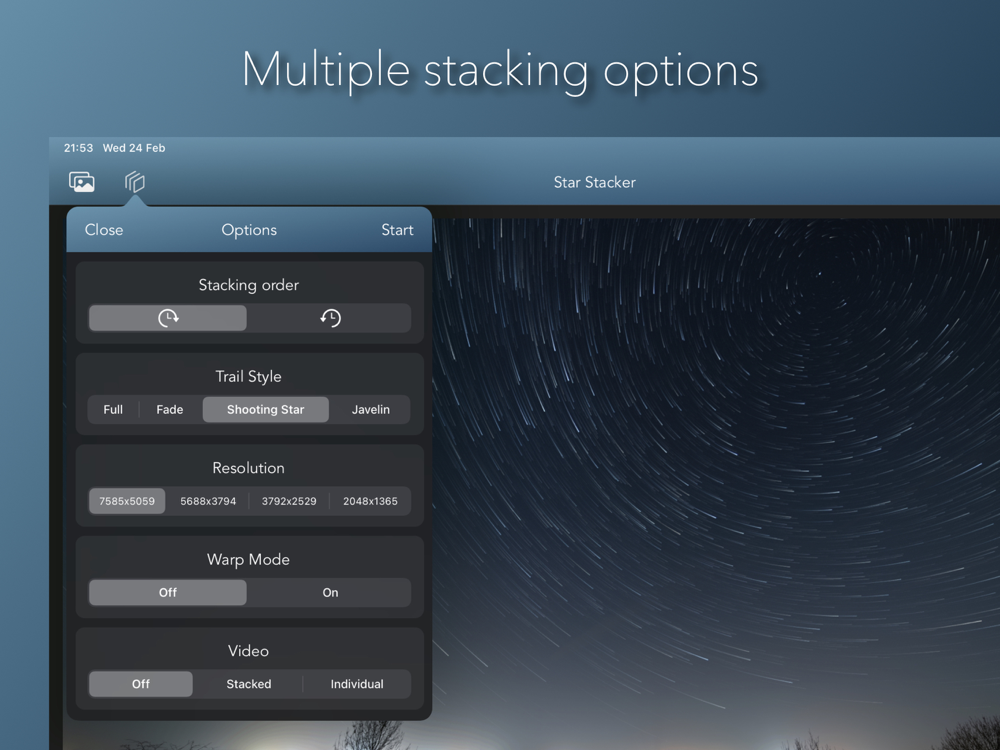 Star Stacker allows you to import a sequence of star photos taken throughout the night and turn them into star trail images or a time lapse video.