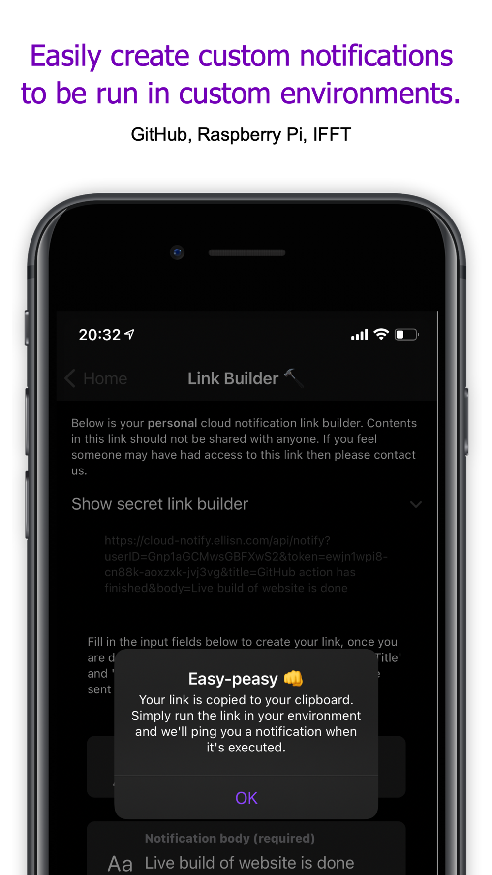 Cloud Notify is very easy to use and implement into your existing projects to allow you to get real-time updates. Simply use the custom link builder to customise your personal notification, copy the HTTP link and implement away! Every time the link is sent, we'll ping your device with your notification.