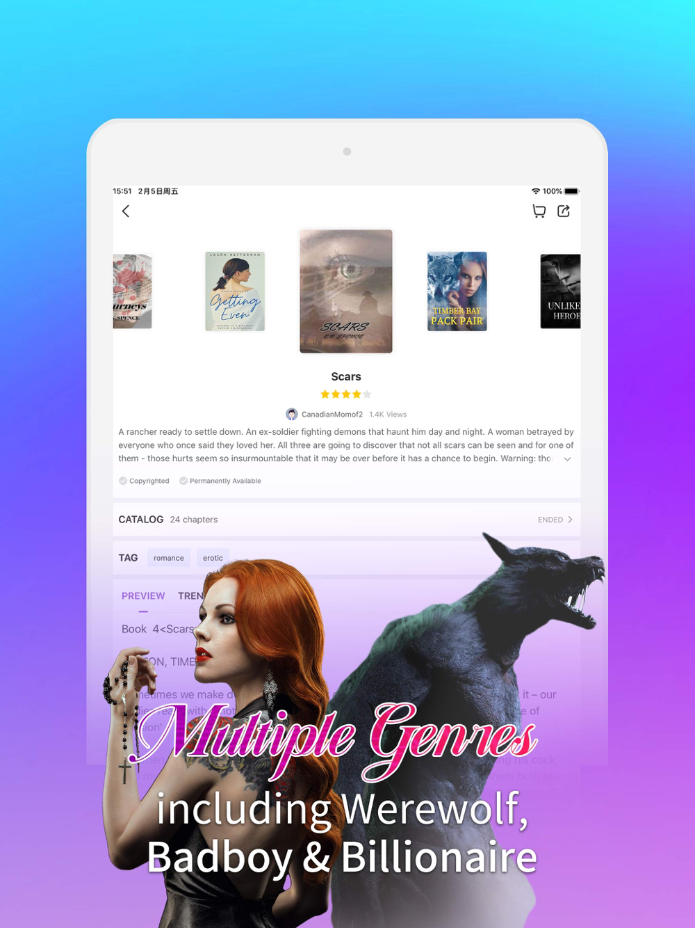 1、Select ANY GENRE you like: werewolf, alpha & omega, mate choosing, rogue wolf, romantic novels, love stories, mafia romance, badboy school stories, light novels, stories with reborn characters, magical realism, eastern fantasy, horror stories, fan fiction for K-POP fans, sci-fi, suspense and thriller, and excellent original stories…