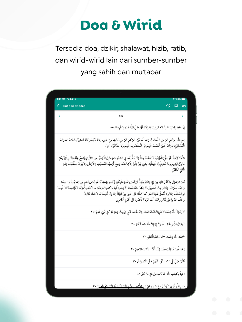 Menyediakan ratusan doa keseharian, kesehatan, perjalanan, kesehatan, dan lain-lain; juga shalawat, ratib, hizib, istighotsah, dan wirid-wirid lainnya dari sumber-sumber otoritatif.