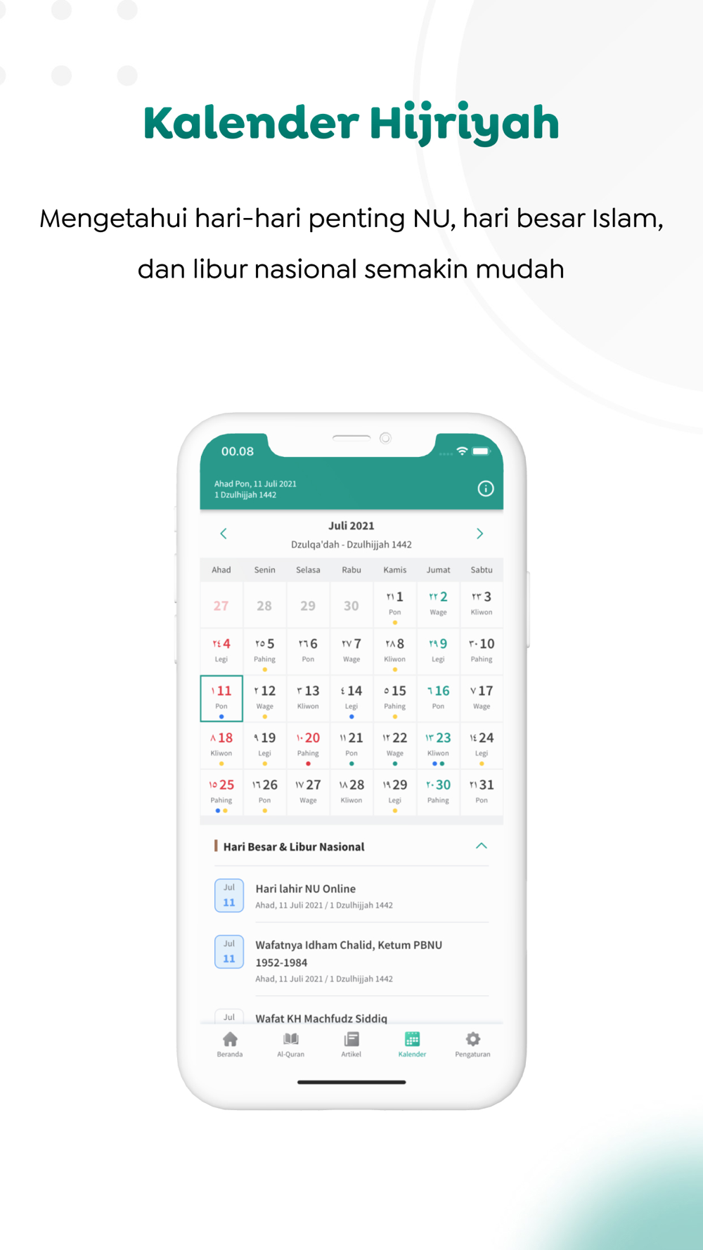 Tak hanya penanggalan Masehi dan Hijriah, kalender ini juga dilengkapi penanda hari pasaran Jawa (Legi, Pahing, Pon, Wage, Kliwon), hari-hari besar Islam, libur nasional, dan momen penting NU.