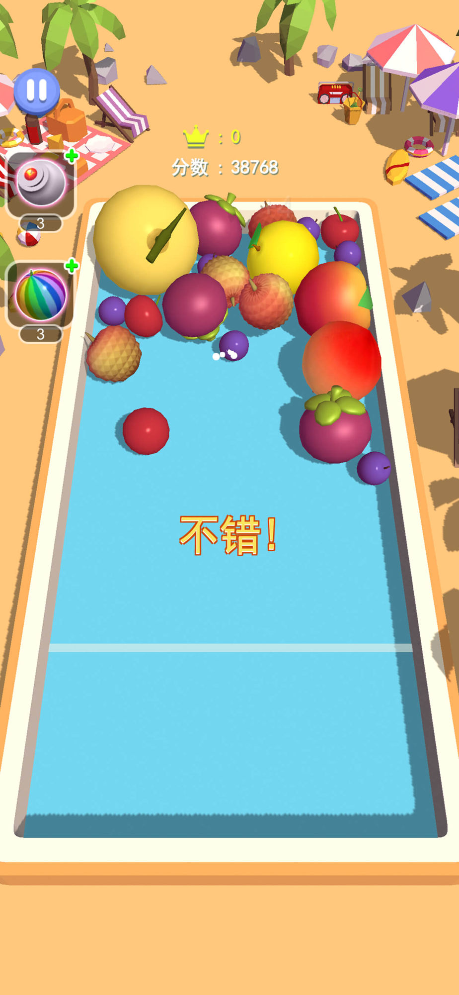 当2个相同水果相遇时,会合并成一个更大的水果,与此同时,会有一个新的水果随机出现在起始线位置。滑动手指饼合并它们,当你每合成一种新型水果即可过关。