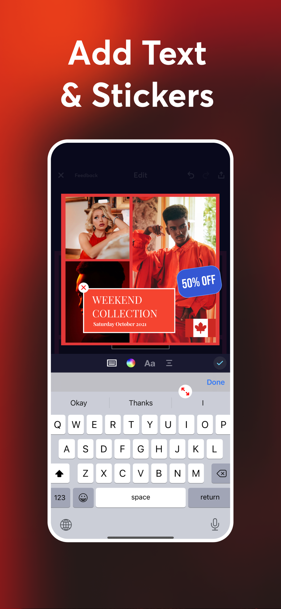 • Ability to move, scale, rotate, and adjust your images, texts, emojis