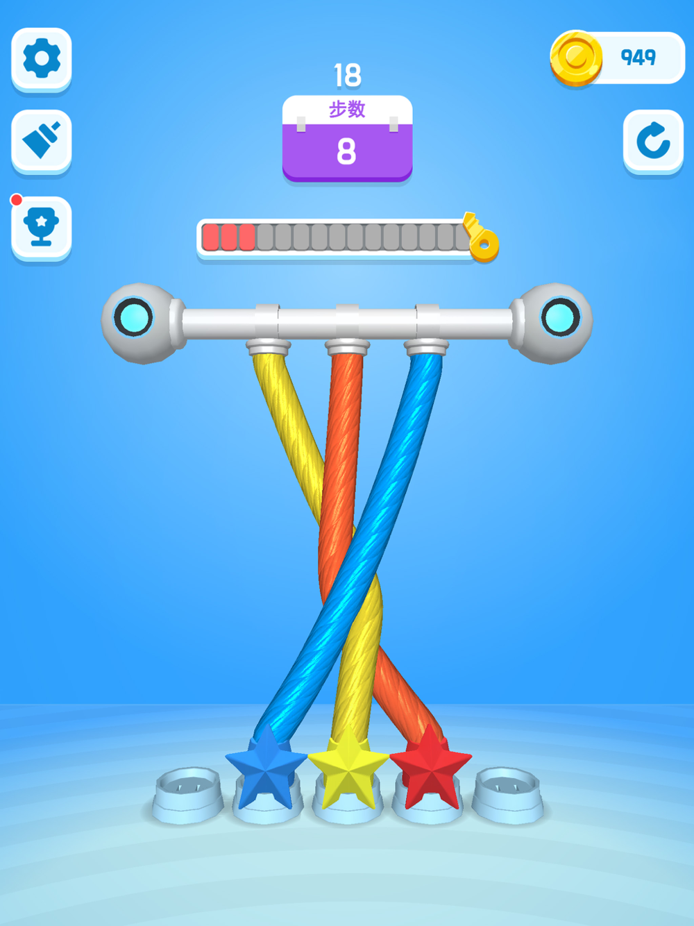 将扭结在一起的绳子在规定步数内解开,使绳子间没有交叉就能通关