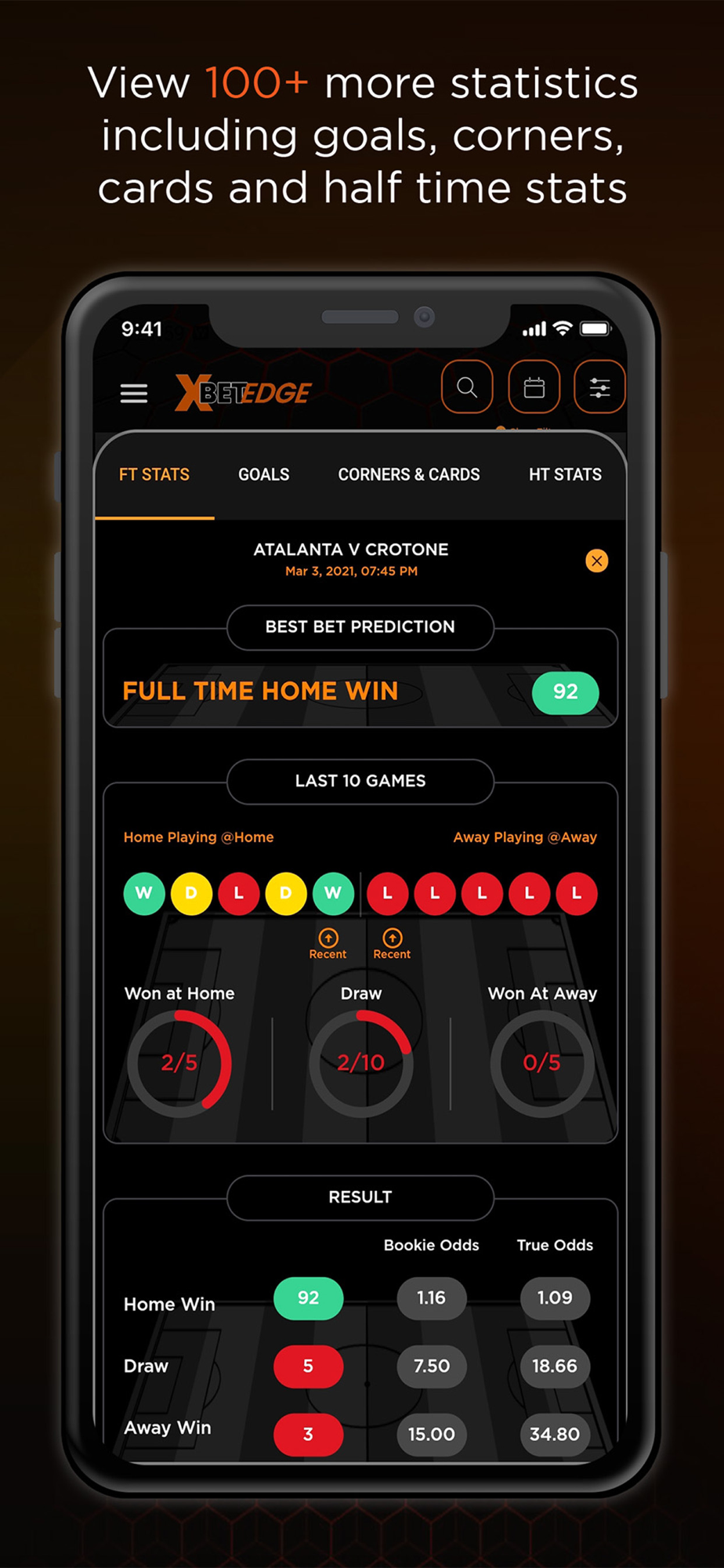 If you are looking for a football/soccer betting stats, tips & predictions app that helps you to win bets in every possible 'legal' way, then go for XBet Edge: Soccer Betting app. It's a complete betting predictor app that will increase your odds. We wish you Good Luck!