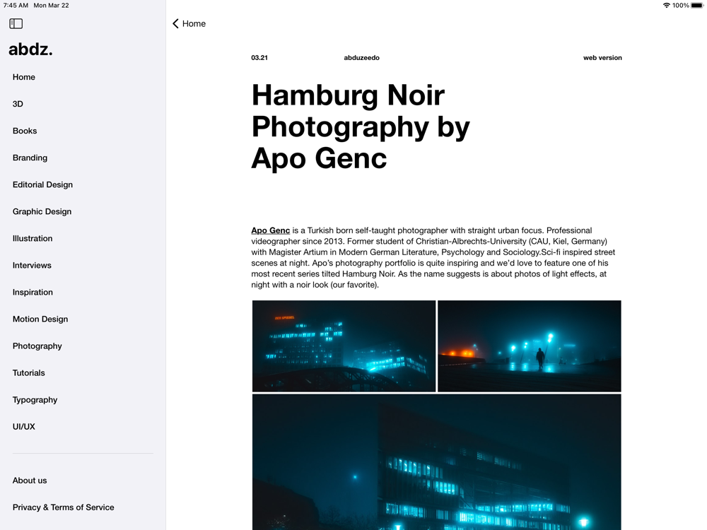 Abduzeedo is a highly curated e-zine focused on good design. As the saying goes, good design is long lasting, and we at abdz.do (the shorter and cooler name) have been witnessing this for the past 15 years by sharing content that inspires us. This is our first application and the best way to experience our content for free. No ads, no tracking, just inspiring content updated daily to your phone or tablet.