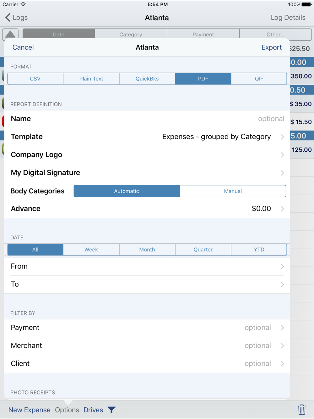 * Email your expense reports in comma delimited (CSV) format for easy import to Excel or Numbers. Photo receipts are also emailed as JPEG attachments