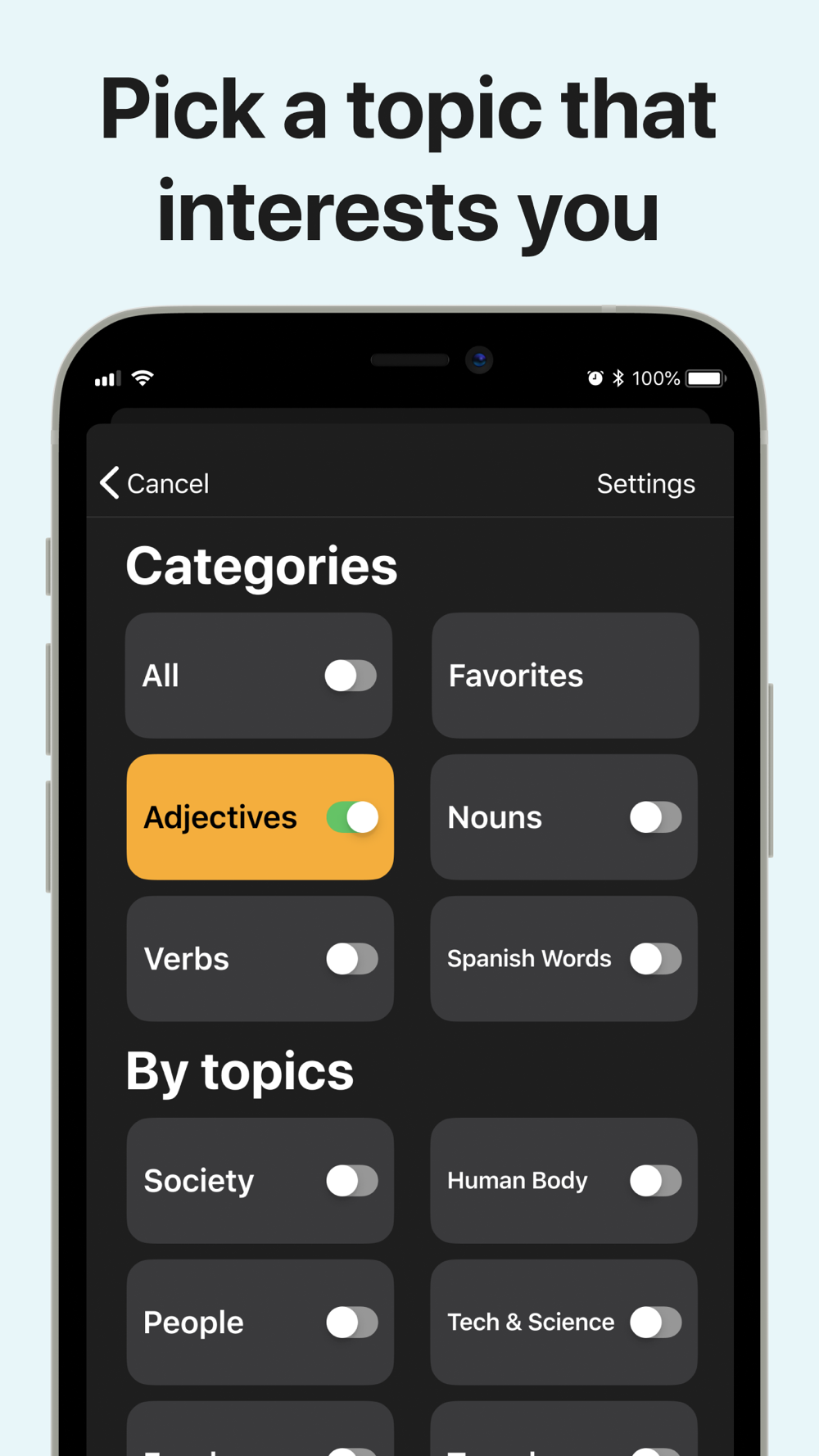 An instant way to learn words is to receive a daily notification with new words, where there is an explanation and context.