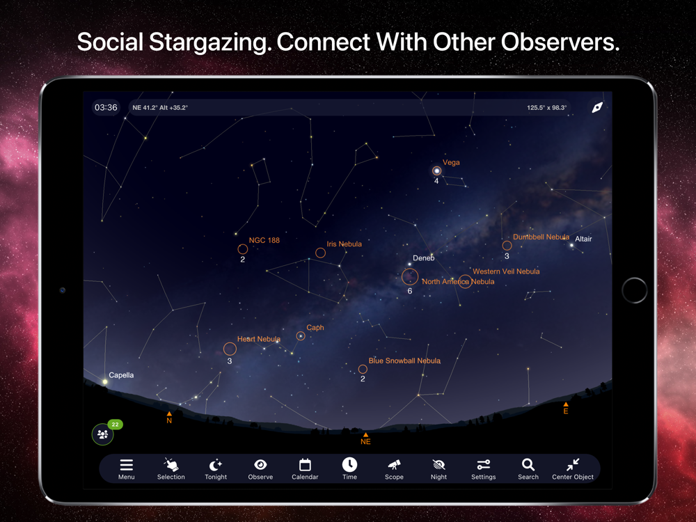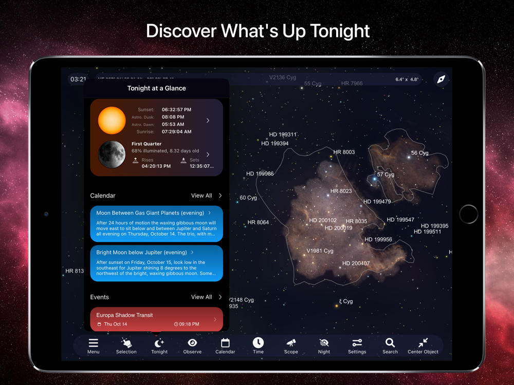 + Sky Tonight - jump to the new Tonight section to see what’s visible in your sky tonight. Expanded information has been designed to help plan your night and includes Moon & Sun info, calendar curations, events and the best positioned deep sky and solar system objects.