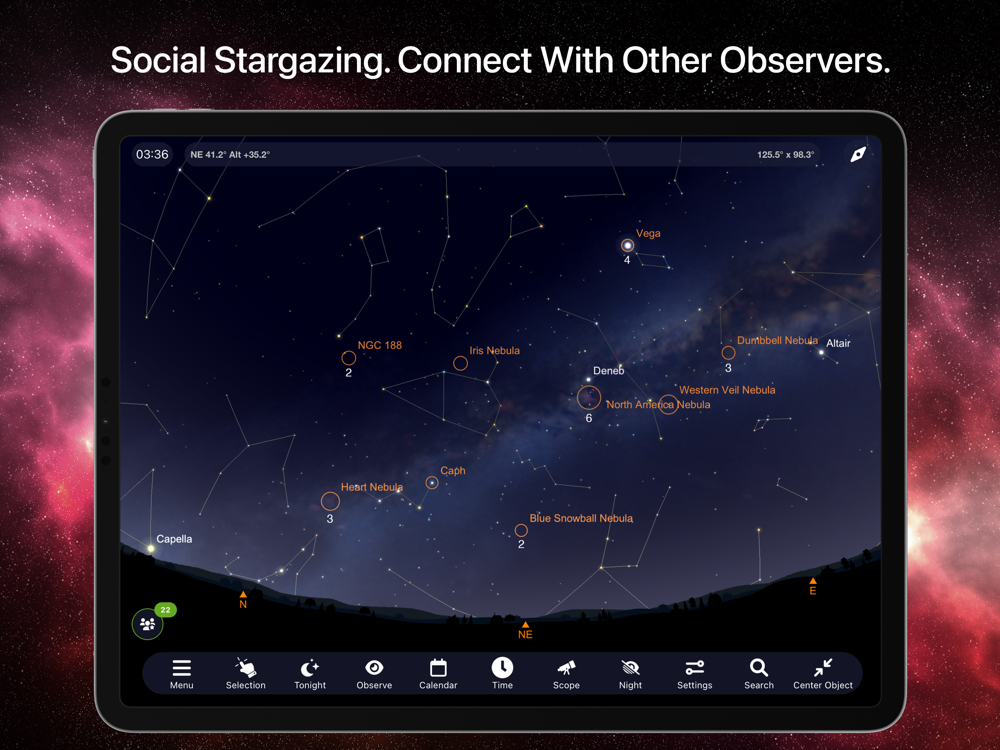 OneSky - allows you to see what other users are observing, in real time. This feature highlights objects in the sky chart and indicates with a number how many users are observing a particular object.