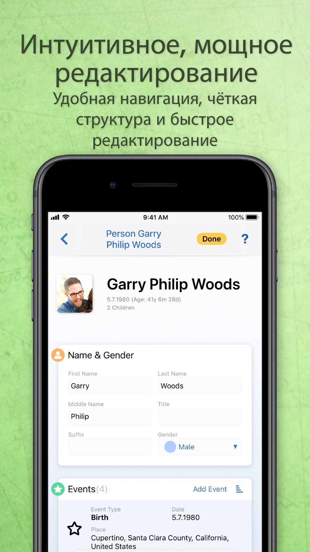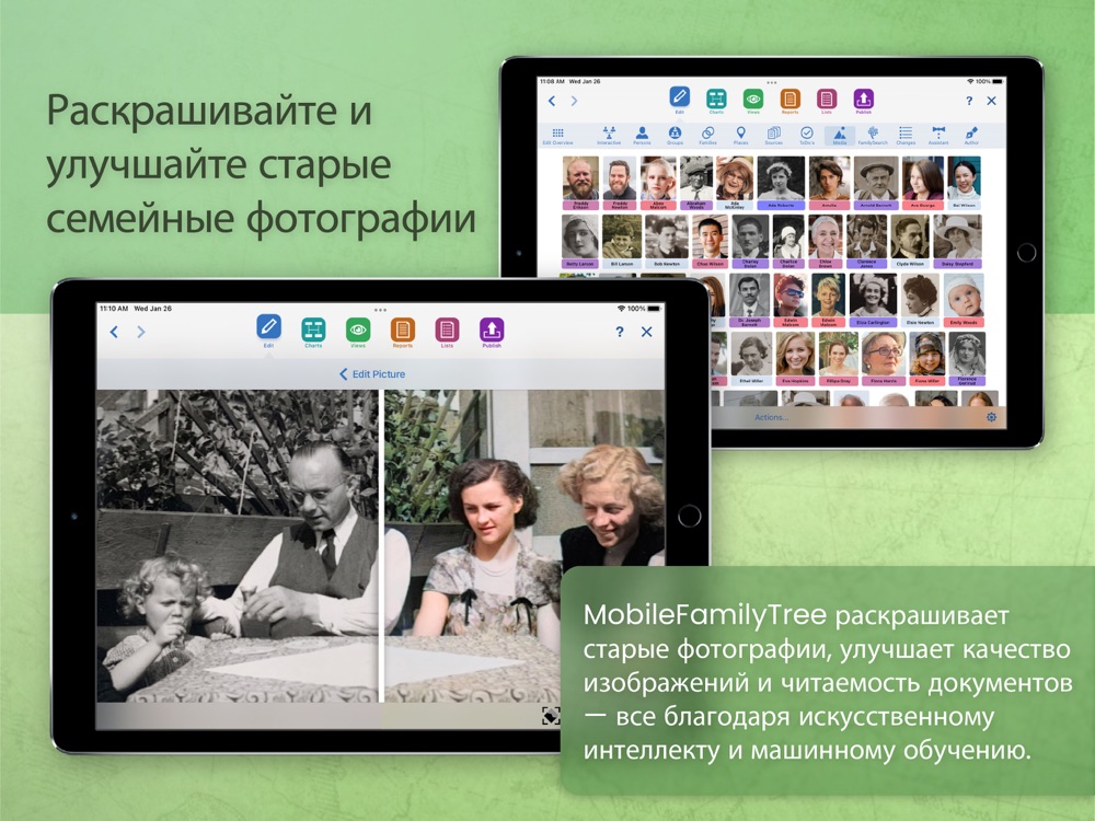 Откройте свою семейную историю! Генеалогия обновляется с MobileFamilyTree 10: современная, интерактивная, удобная и быстрая. Изучите своё генеалогическое древо и историю семьи. Создавайте впечатляющие диаграммы, оценки, отчёты и книги, перемещайтесь по интерактивному или виртуальному 3D древу, взгляните на генеалогию по-новому.