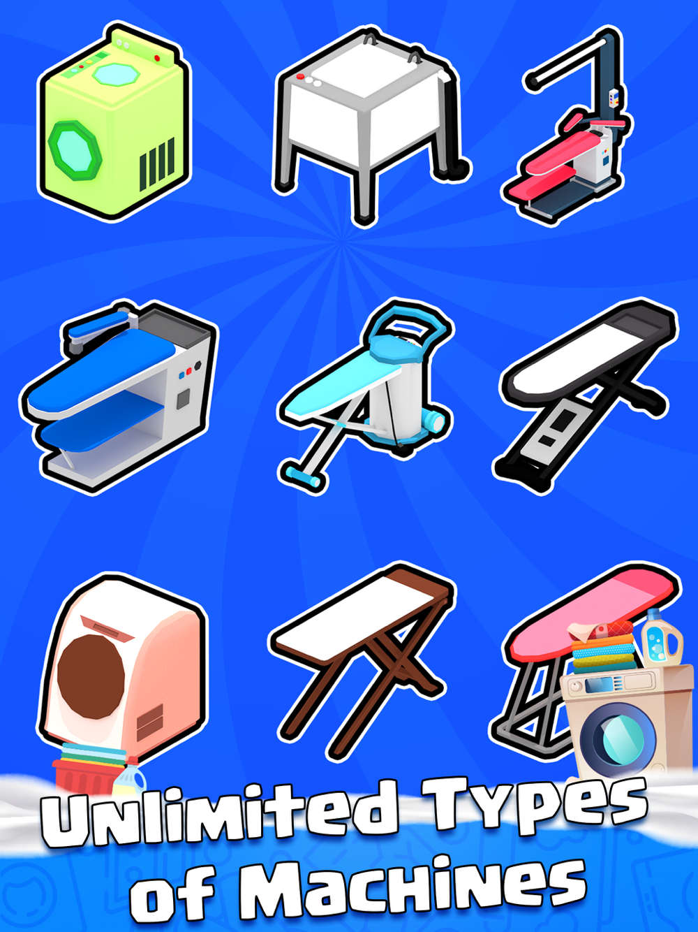 You start with a washing room and then build a drying room, then an ironing room, dry-cleaning room, etc. Buy new machines and improve them. You can also decorate the rooms by buying furniture and goods.