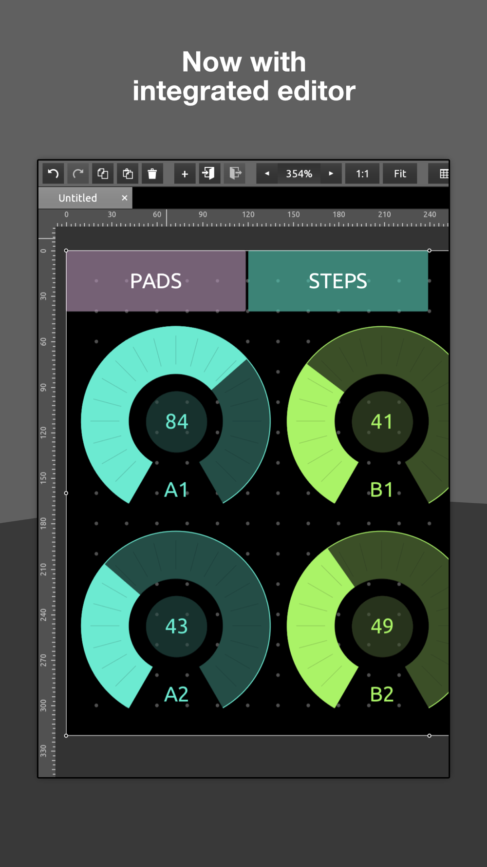 We've listened for the past 10 years and we've re-written the application from the ground up - with speed, features and usability in mind. A GPU-powered, fast and advanced integrated editor is part of TouchOSC on all platforms - create the most complex of control layouts with ease and precision.