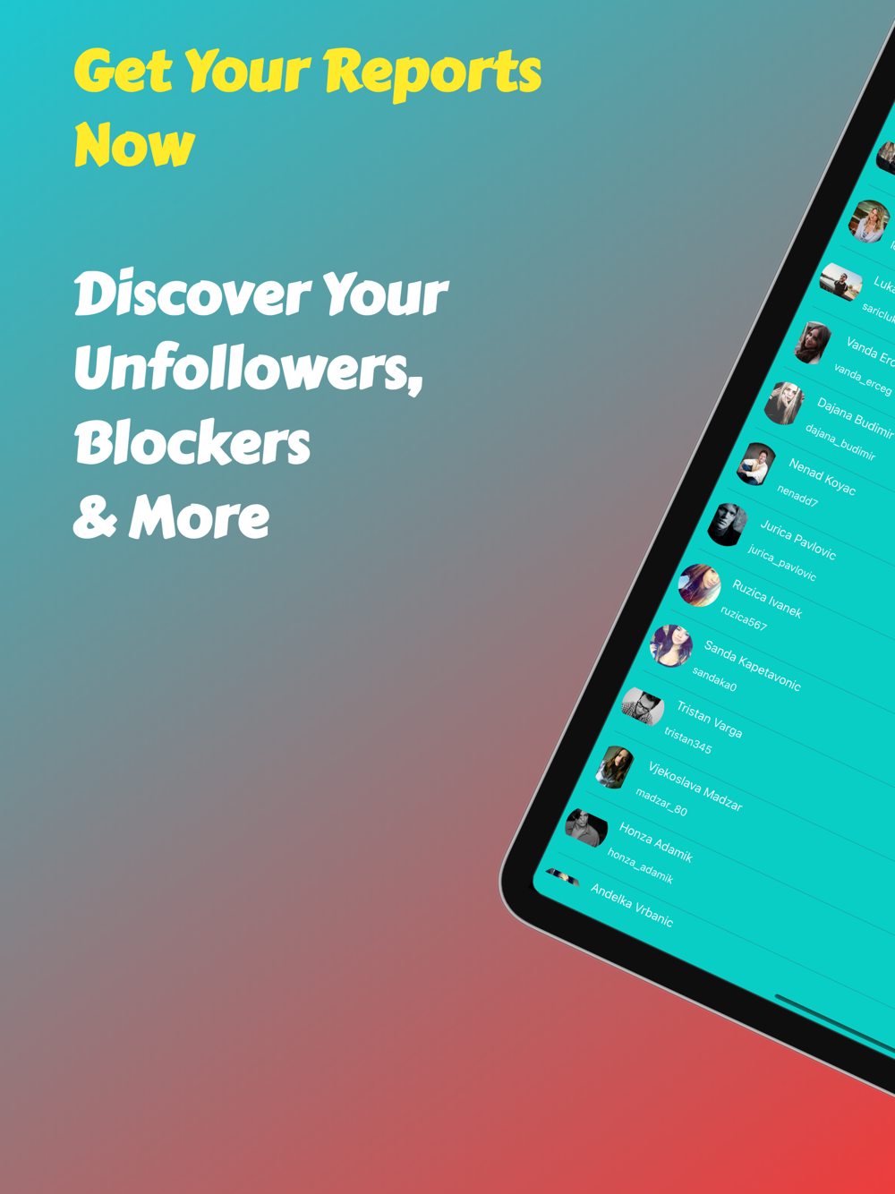 Reports ◦ for Instagram is the best and safest tool for your followers analyzer. You can now analyze your followers & followings growth, find out your unfollowers, view who blocked you and much more!