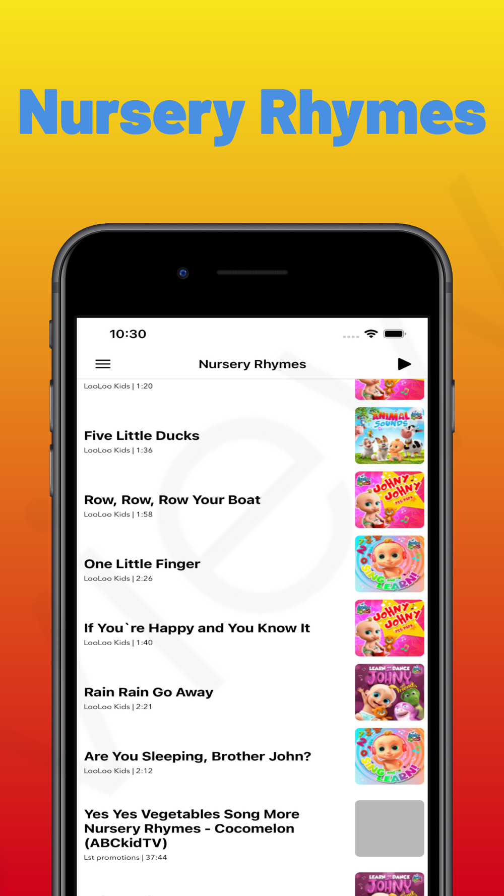 In Coco-Melon Kid Songs app, you can watch and find more popular nursery rhymes videos, such as: Wheels on the bus, Twinkle Twinkle Little Star, Baa Baa Black Sheep, etc.