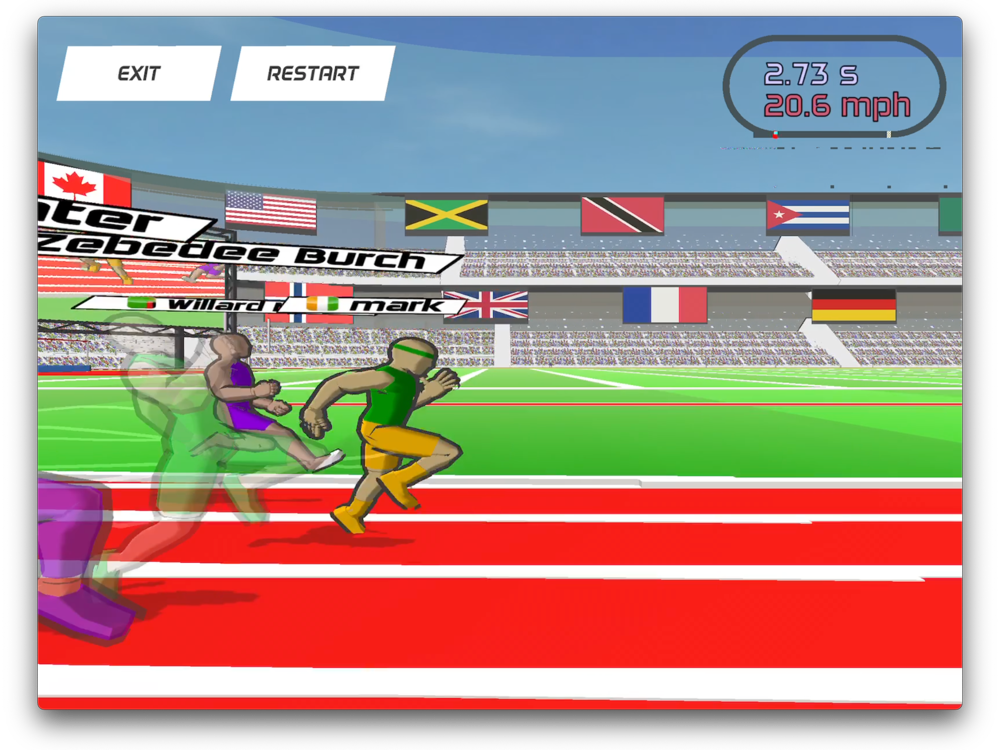 Fun, competitive and fast-paced physics game! Use simple 2 finger touch controls to move your character's legs and zip down the 100m straightaway. Master your timing, and before you know it you'll be zooming at scintillating speeds, smashing personal bests, and climbing the global rankings!