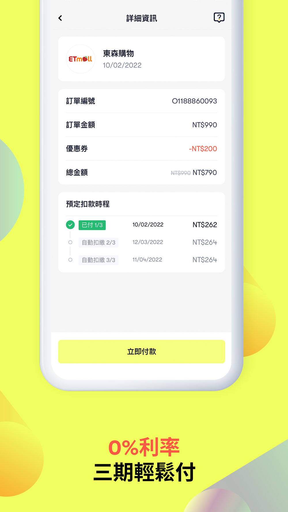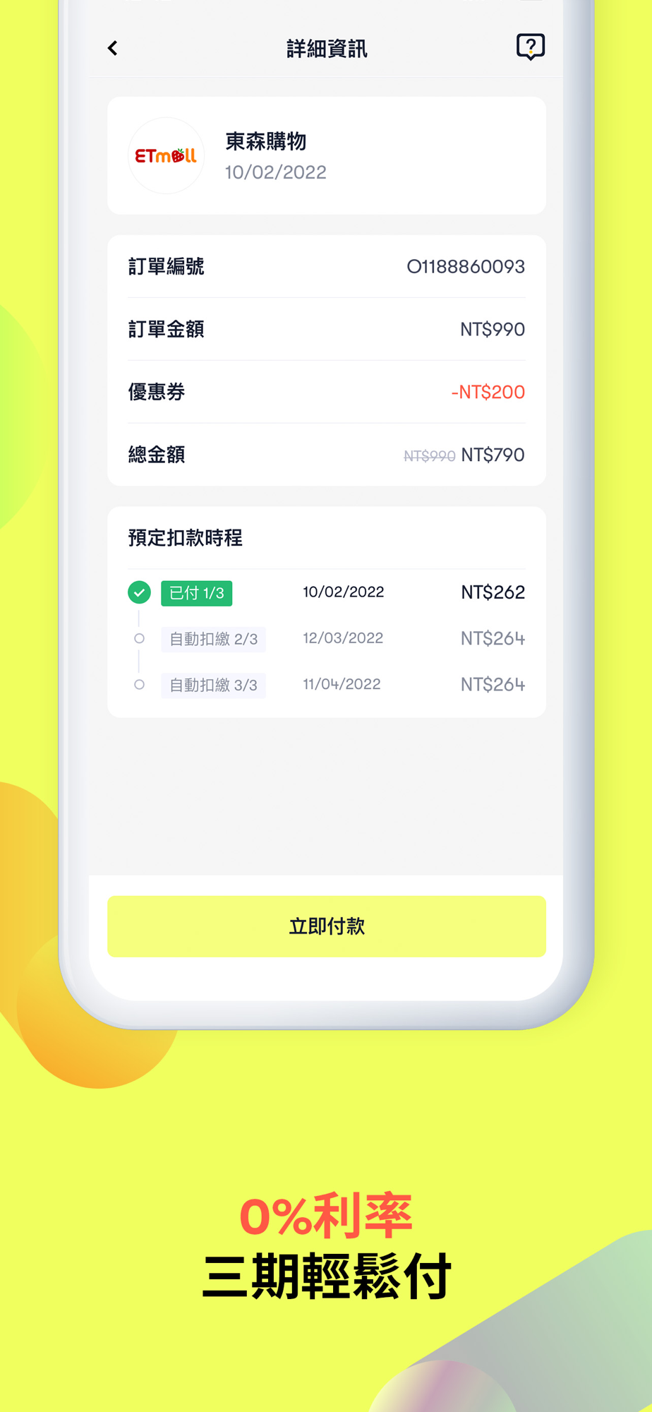 在台灣數百家合作品牌商店購物時,使用Atome自動將您的賬單分成 3 期免息分期付款。購買時只需支付金額的 1/3,即可獲得您喜歡的商品。接下來的兩次付款將間隔30 天。 0%利息。無服務費。無隱形消費。