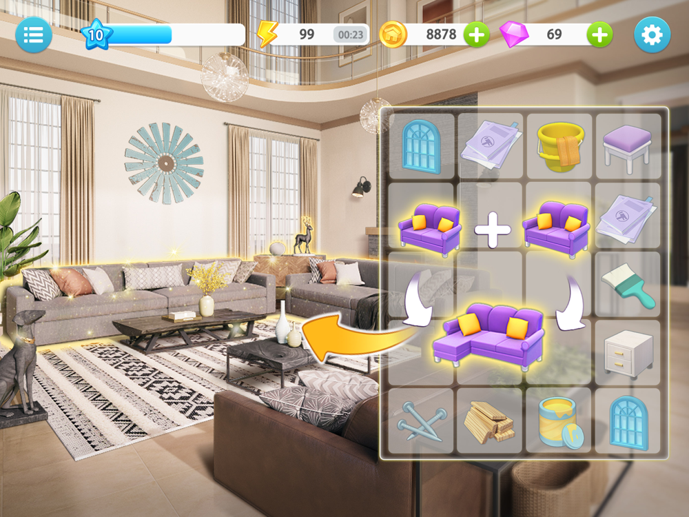 Welcome to Merge Home Master, the best combination of merge and design! Live in this world of merge mansion, you can create your dreamy house, remove the outdate furniture and make house design! If you are also a super fan of merge games, you will not miss this game! Merge different types of items and create the fashion furniture and decoration!