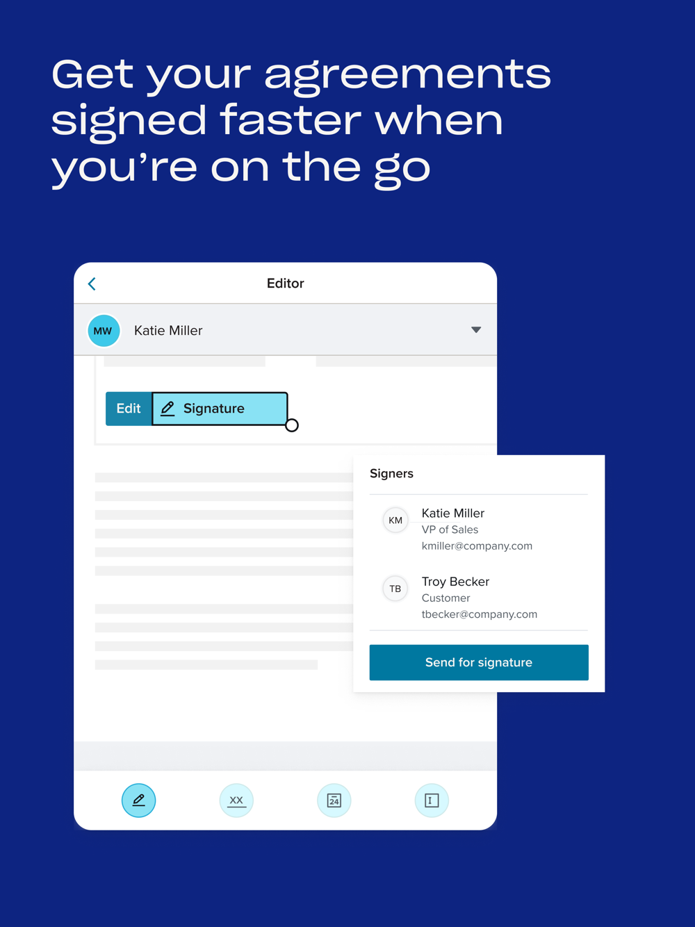 The Dropbox Sign mobile signature app is the fastest way to request signatures from the convenience of your phone, so nothing gets in between you and that next signed agreement. After all, work doesn't stop when you're away from your computer. Dropbox Sign streamlines your document workflows by helping you prepare, send, sign, and track agreements with legally-binding eSignatures.
