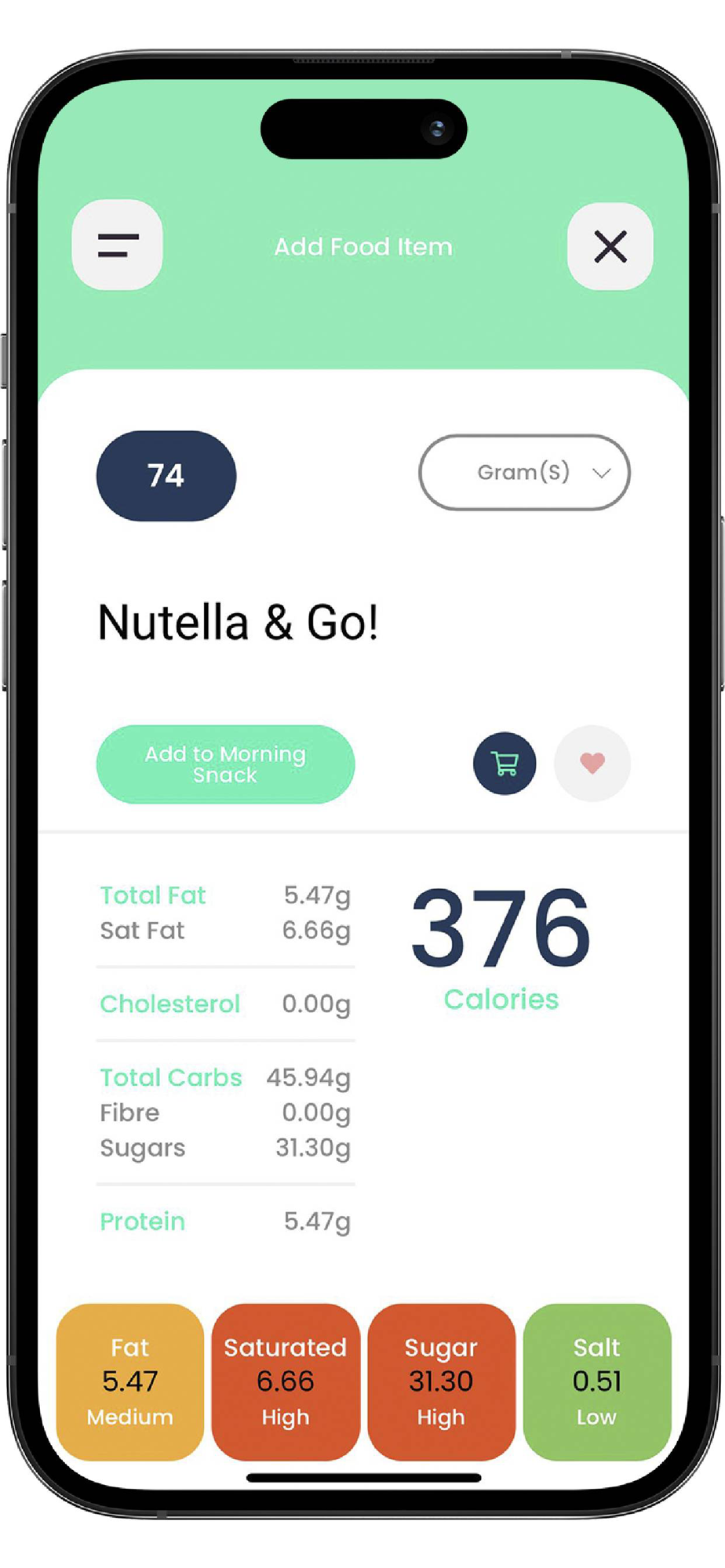 • Color-coded macro results (Low-Medium-High) for each ingredient/product search (Fat, Saturated Fat, Sugar, Salt).