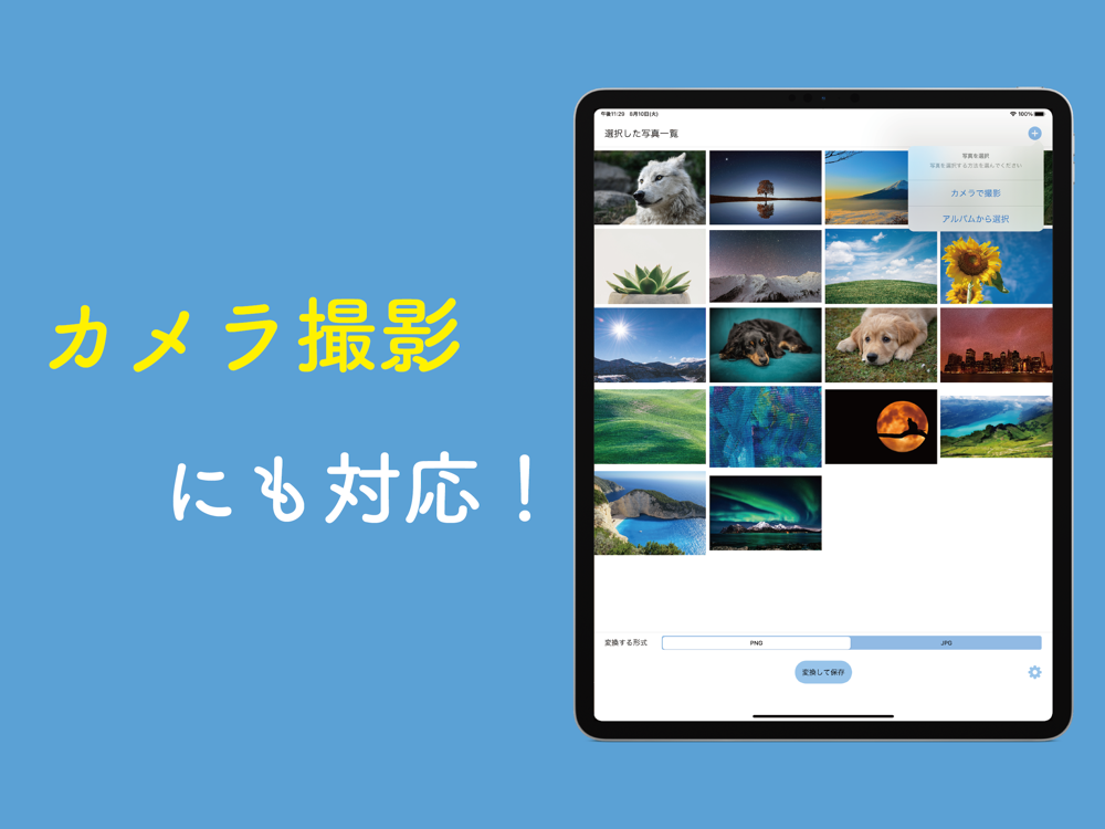 形式(拡張子)を変換したい画像をアルバムから選択、またはカメラで撮影します。