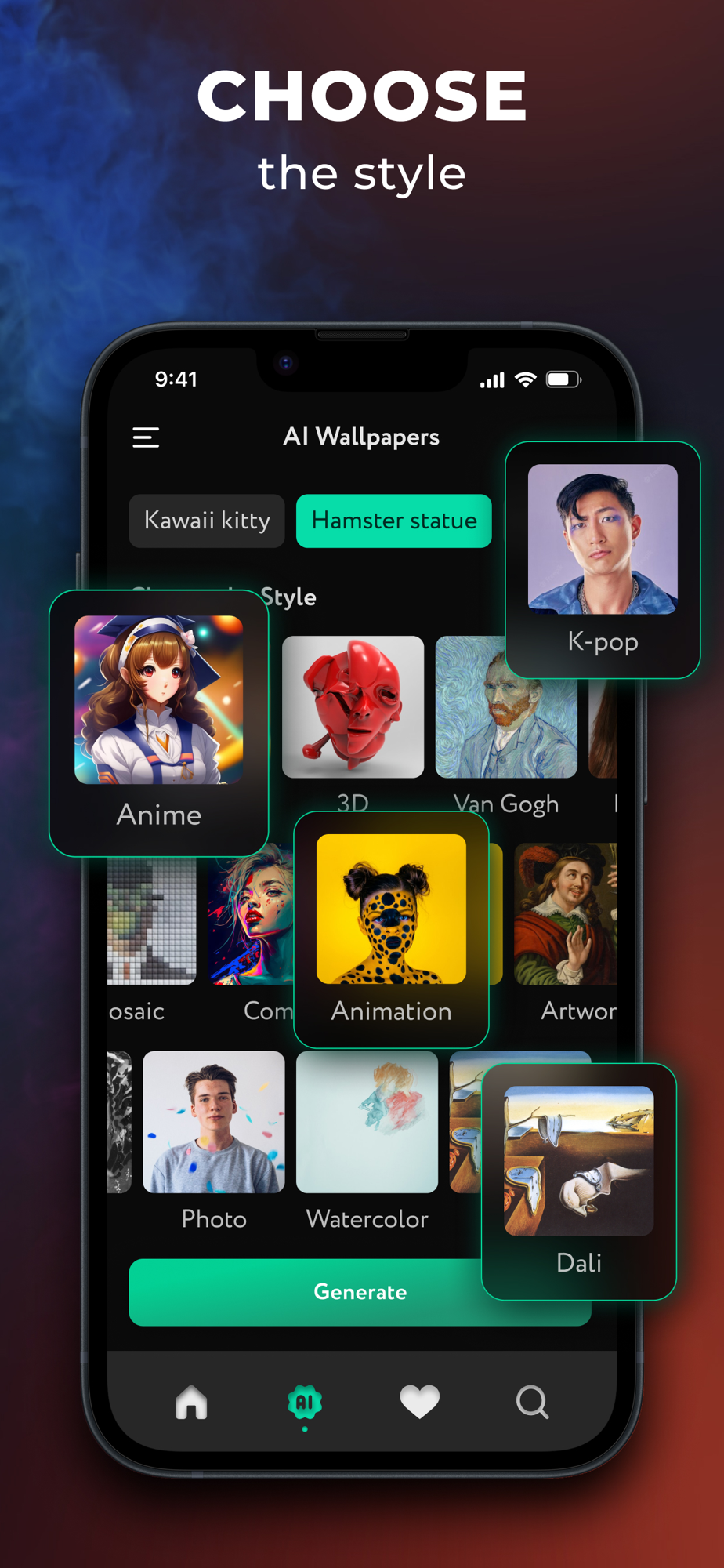 Generate wallpapers for your phone using AI. It's very simple and fun. Describe what you would like to see in the image, choose a style (K-pop, anime, realistic, etc.) and our app will generate amazing quality wallpapers for you based on your request.