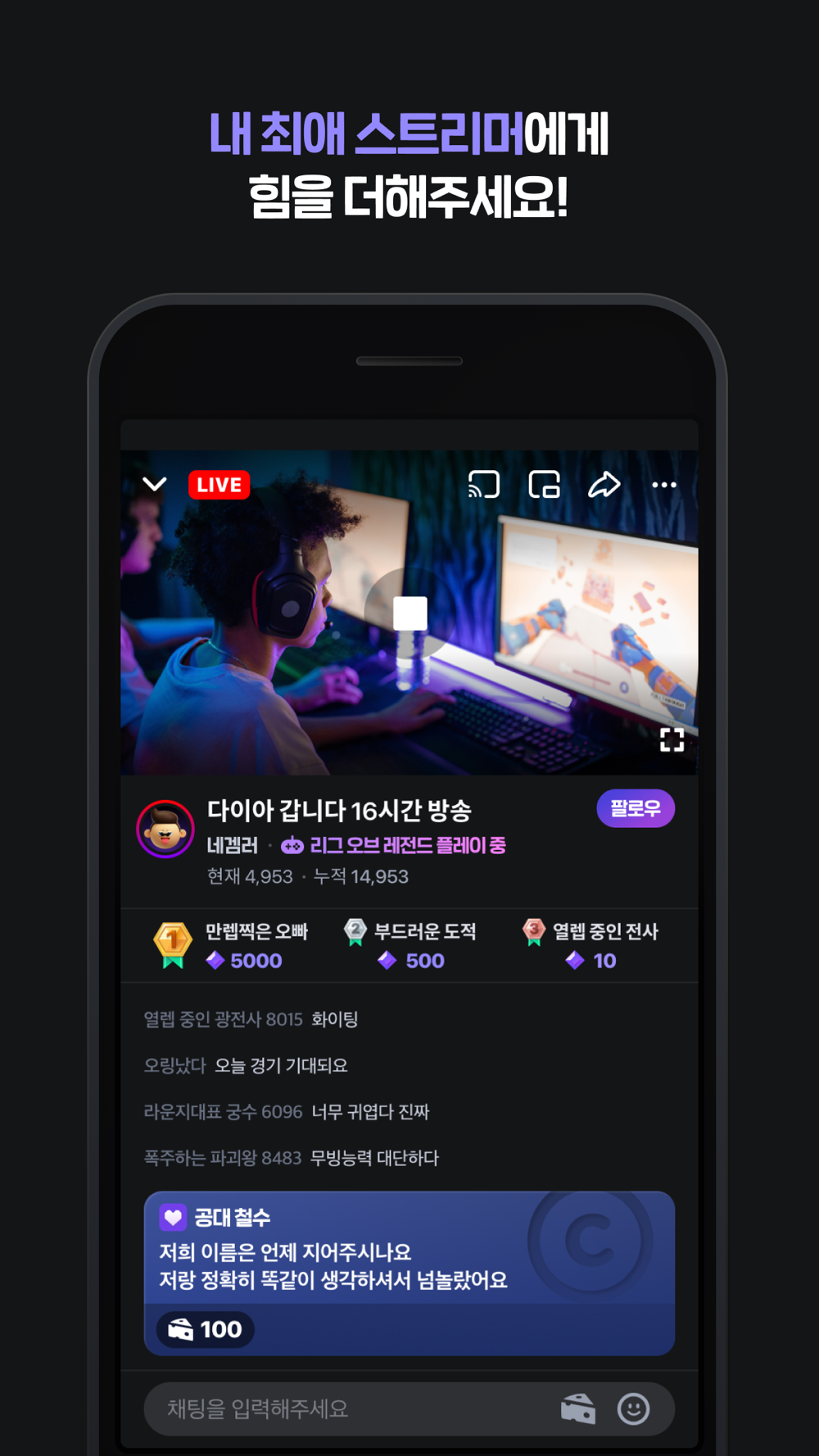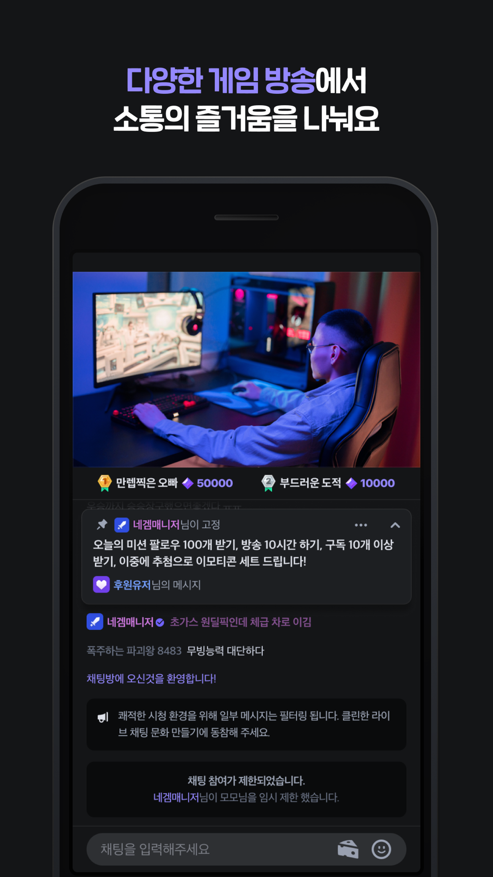 > 게임 방송에서 시청자들과 채팅하고 후원하며 소통의 즐거움을 나눠보세요.