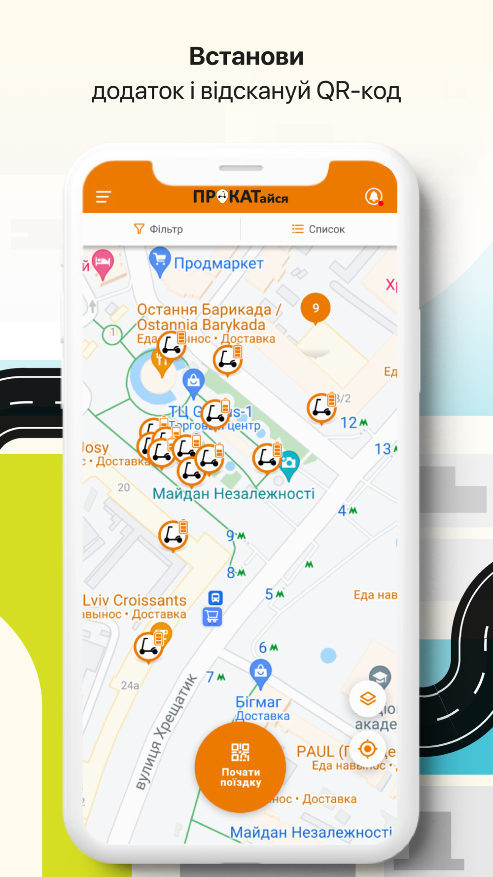 - знайди найближчий самокат на карті та відскануй QR-код на рулі