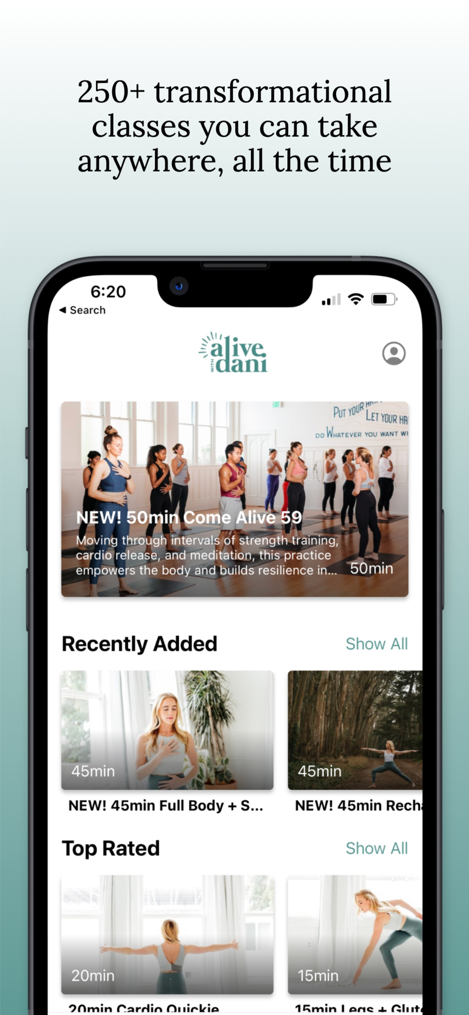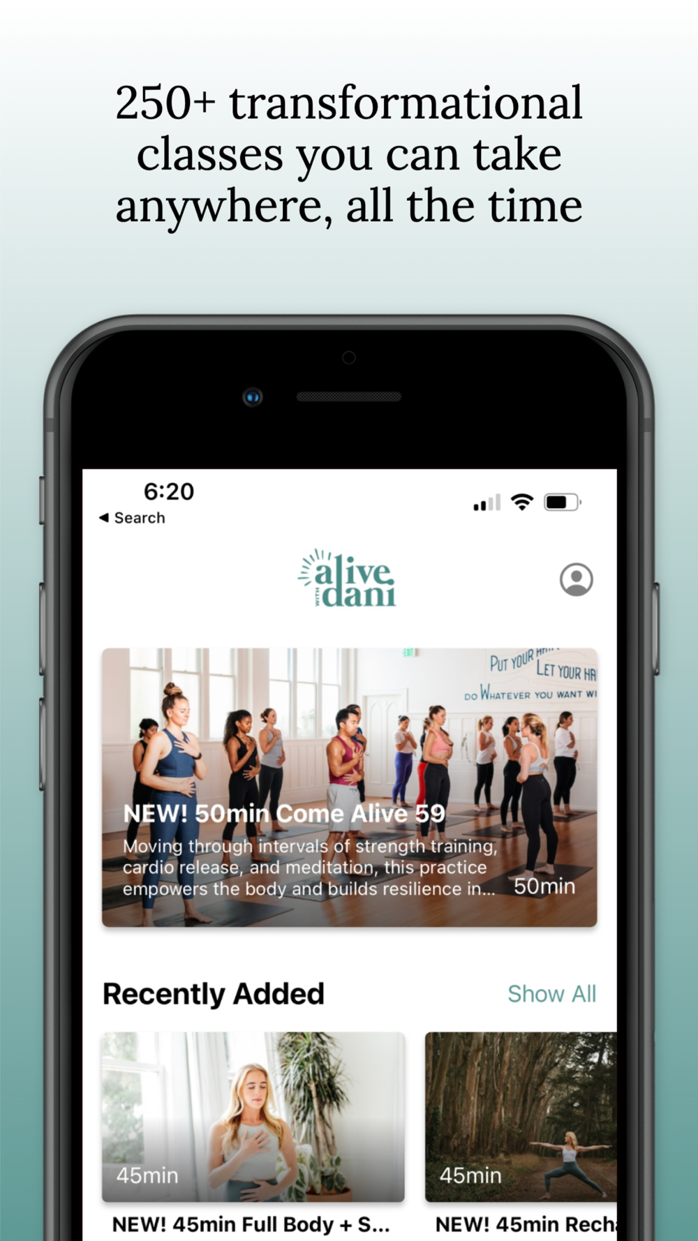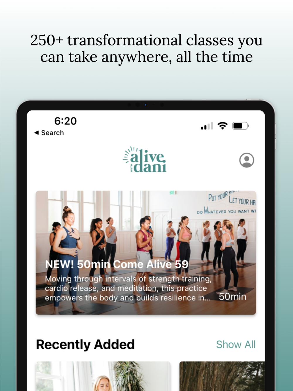 Unlimited live virtual classes — move with your community from anywhere. Join Dani via live stream for 50 and 60-minute Come Alive and Alive in Flow classes, up to three times a week.
