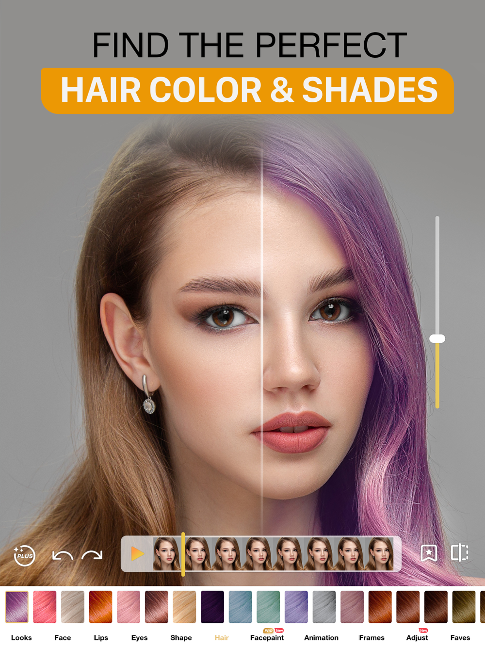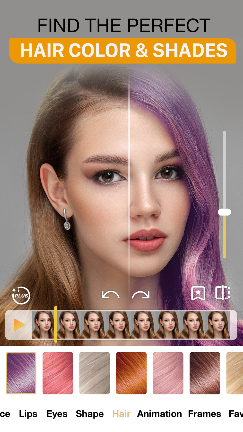 Scroll through endless hair dye options and decide which shade suits you best. The hair color changer tool helps you experiment with a range of colors virtually in your videos without any of the commitment or risk of a permanent dye job.