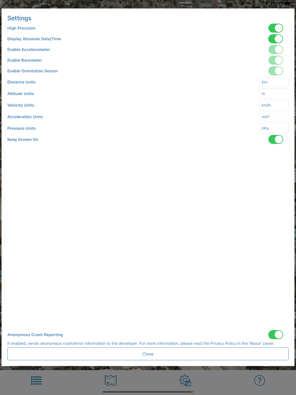 - Records your location, speed, altitude, acceleration, g-force (if available), atmospheric pressure (if available) and device inclination (if available)