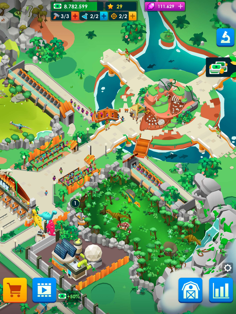 Dinosaurs demand specific attention according to their species. Unlock new enclosures and set them up to provide dinosaurs with the best possible environment! See all the areas with the proper natural vegetation, include as many water zones as they require, and, of course… Keep the visitors safe! Dinos are delicate creatures. Try to keep them nourished and happy.