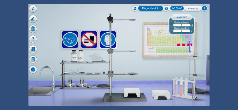 In this simulator it is possible to carry out the synthesis of acetylene used as welding fuel, which must be done from calcium carbide and water. The simulator recreates a chemistry laboratory with a reaction balloon, a separatory funnel, two lighters, a Baeyer's reagent, bromine water, and ammonia nitrate, among other elements necessary to carry out the synthesis.