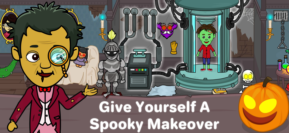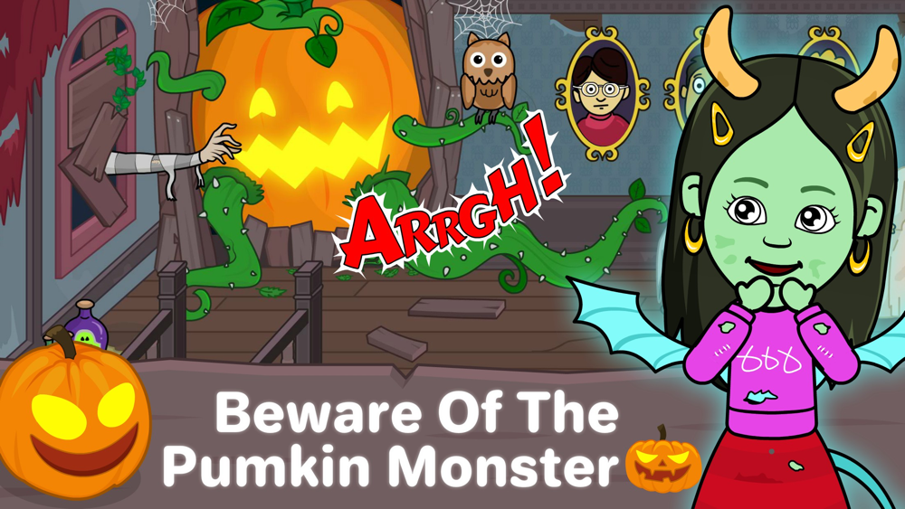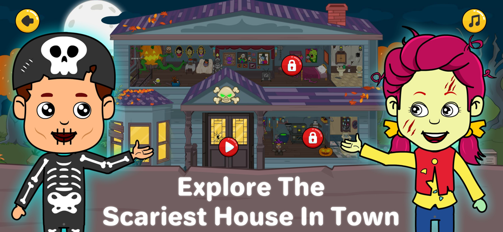 This scary mansion in my Tizi town has ghost games and activities. The spooky pumpkins are keeping an eye on you. Play with the scary dolls, vampires, and witches in this horror home.