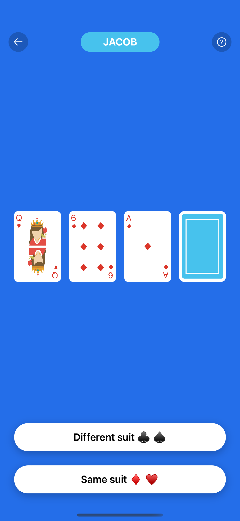 Guess if the suit of the upcoming card (for example, hearts or spades), is part of the previous drawn cards.